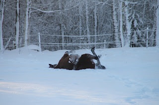 Alla djuren väntar tåligt på sin mat hästarna har kommit ut och står och mumsar i höautomaten, hundar och katterna är nöjda och belåtna. Nu är det bara för mig att äta lite frukost och sedan lite jobb.